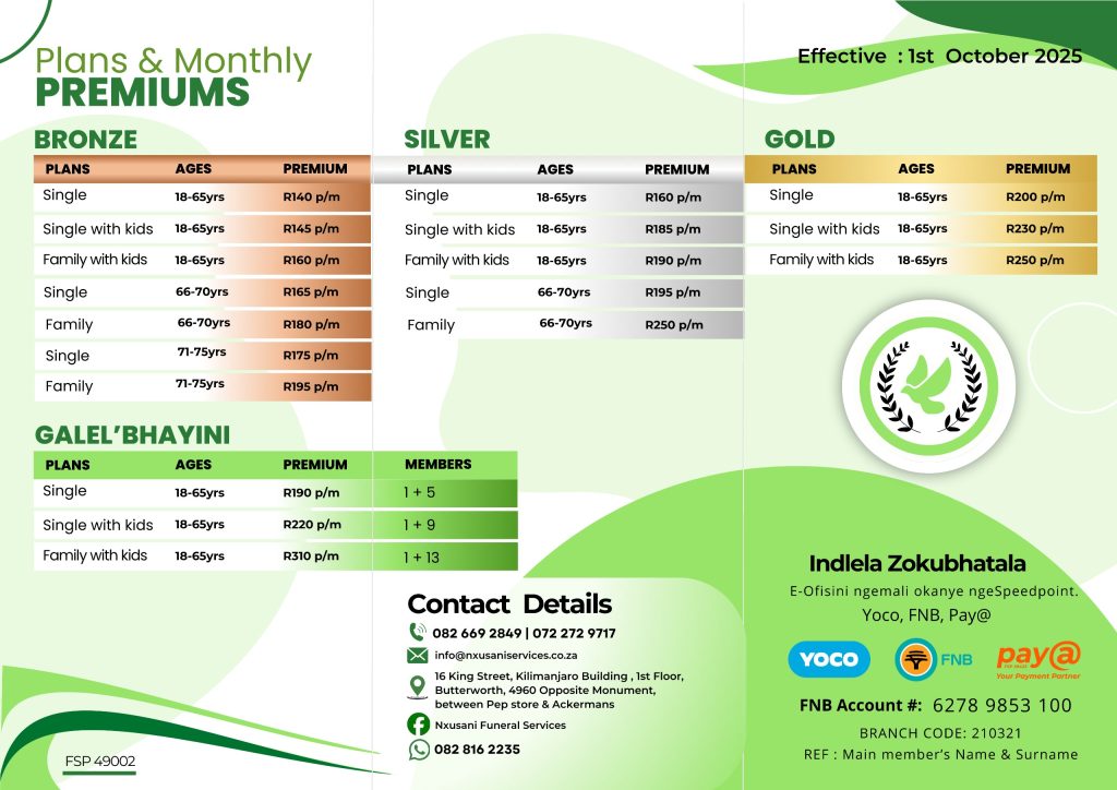 Nxusani Services offers affordable funeral plans designed to give your family comfort, dignity, and support during difficult times. As a family-owned business, we understand the importance of protection and preparedness. With simple monthly premiums, you can secure peace of mind knowing that your loved ones will be cared for.